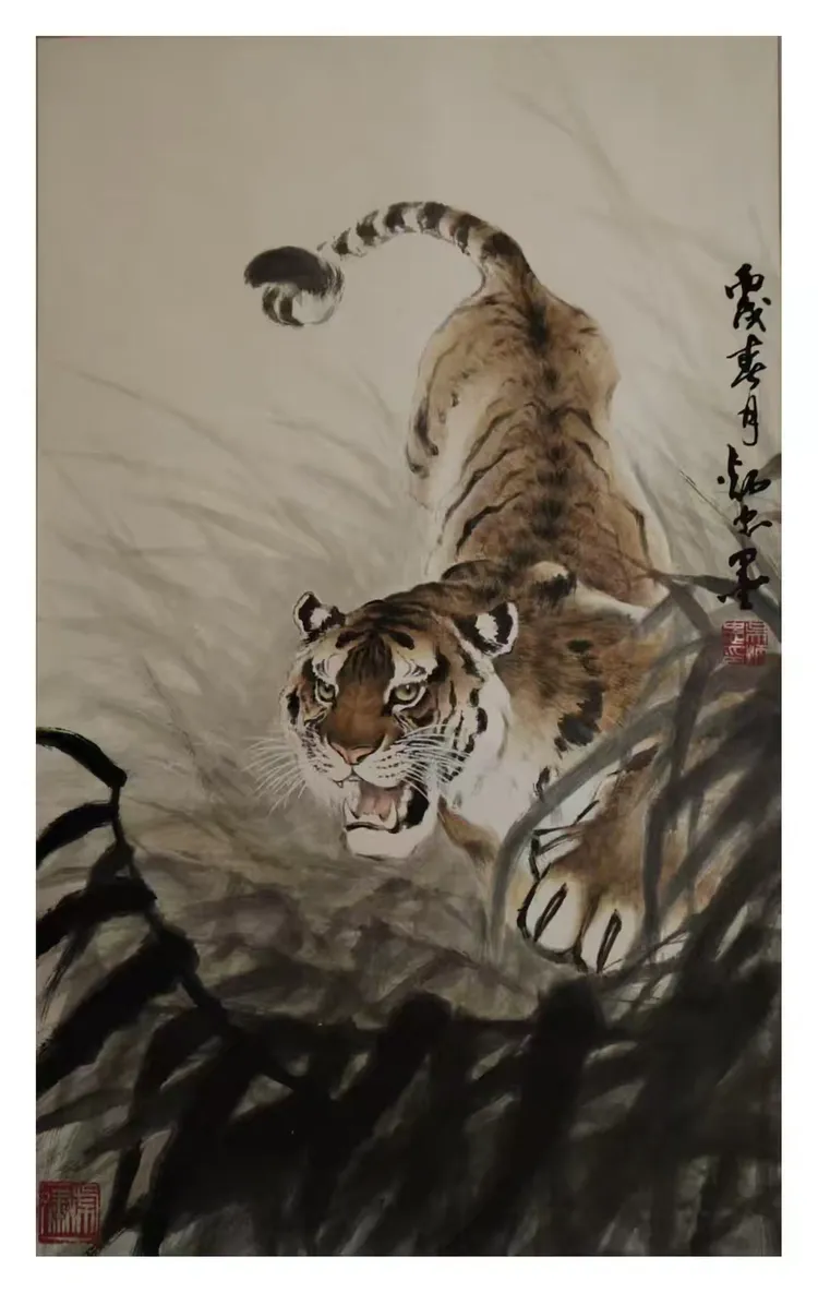 草丛深处,光影斑驳,一只虎悄然前行,目光如炬。它的每一步都带着警觉,每一根毛发都蓄满力量。吴炳忠以淡墨渲染背景,让老虎成为画面唯一的焦点,如同舞台中央的主角。这不是一场猎杀的前奏,而是一种存在感的宣告——威猛而不张扬,警觉却不焦躁。在这片朦胧的绿意中,虎的身影既是自然的奇迹,也是艺术家对生命尊严的致敬。