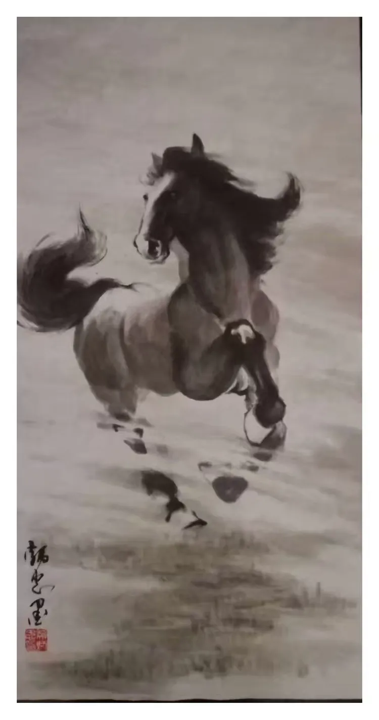 骏马奔腾,四蹄腾空,鬃尾飞扬,仿佛踏风而来。吴炳忠以水墨写意的手法捕捉这疾驰的一瞬,线条流畅而有力,墨色浓淡相宜,展现出中国传统绘画“以形写神”的精髓。马的姿态充满动感,却又不失稳健,正如这个时代,在飞速前行中保持着内心的定力。画面下方的题字与红印,不只是点缀,更是艺术家精神世界的落款——奔腾的是马,也是岁月,是梦想,是一个民族不断向前的脚步。