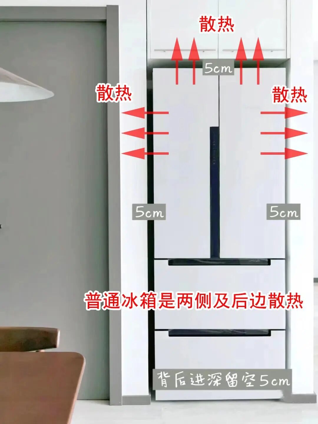 更坑的是散热问题。普通冰箱是两侧及后边散热,所以两侧、上面、后面都需要预留5cm~8cm散热距离。