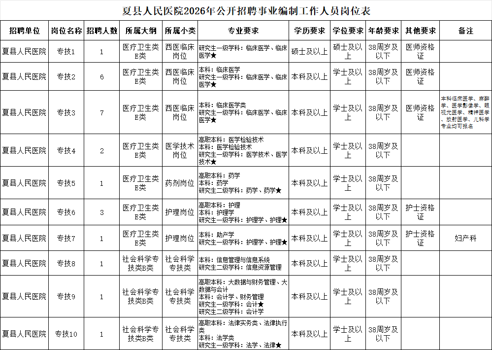 近日,山西省人社厅正式发布 2026 年事业单位公开招聘公告,夏县人民医院面向社会公开招聘事业编制人员 24 名,涵盖 10 个专业岗位,具体招聘专业、学历要求及岗位详情见岗位表(附后)。
