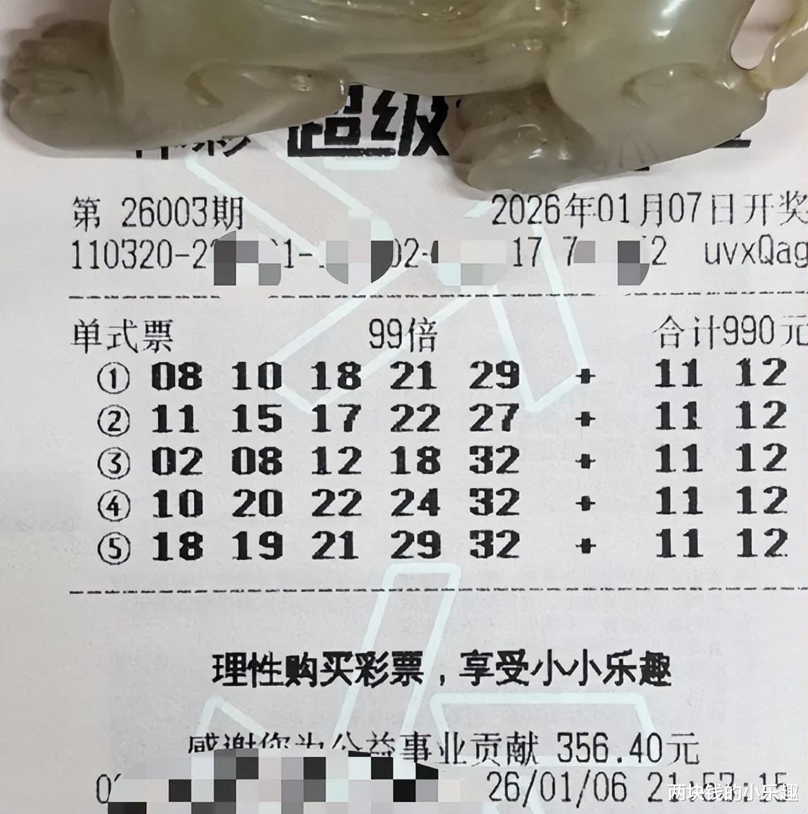 大家好,今天是1月7日,星期三,又到了新一期大乐透开奖的日子了,今晚即将开奖的是第26003期,开年第一期出现一波小井喷后,上期整体回归了平静状态,不少彩友一时又陷入了困惑,不知本期该如何做出决定,不过也有一些彩友依旧是早早果断的完成了出票,下面请大家开始欣赏: