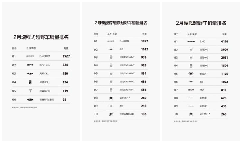 作为中国硬派越野市场的引领者,BJ40推陈出新,持续进化,BJ40增程、BJ40燃油、BJ40增程元境智行、BJ40探险家、BJ40增程赤兔版相继推出,好评不断。今年2月,BJ40登顶硬派越野车销量排行榜,BJ40增程登顶新能源硬派越野车销量排行榜和增程式越野车销量排行榜。BJ40持续登顶硬派越野销冠王,BJ40增程连续11个月称霸增程越野市场。目前,BJ40全球用户总量已经突破30万。