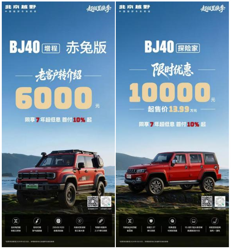 此外,北京越野还为BJ40增程赤兔版和BJ40探险家推出了专属优惠福利。北京越野老车主推荐购买BJ40增程赤兔版,可获得6000元奖励,这不仅是对老车主忠诚度的回馈,更将“省钱”的机会从购车者延伸到了推荐者身上;BJ40探险家限时优惠10000元,起售价13.99万元。直降优惠让这款车型以更具竞争力的价格进入更多消费者的视野,省了多少一目了然。