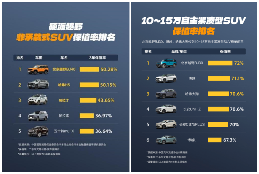 保值率方面,北京越野更是遥遥领先,根据中国国际贸易促进委员会汽车行业分会汽车金融暨保值率研究委员会发布的“硬派越野非承载式SUV保值率排名”榜单,北京越野BJ40以50.28%的3年保值率强势登顶,进一步印证了其在产品力、用户口碑与长期价值层面的全面领先。根据中国汽车流通协会和精真估联合发布的《2026年2月中国汽车保值率研究报告》显示,北京越野BJ30在10-15万自主紧凑型SUV市场以72%的保值率位居榜首。