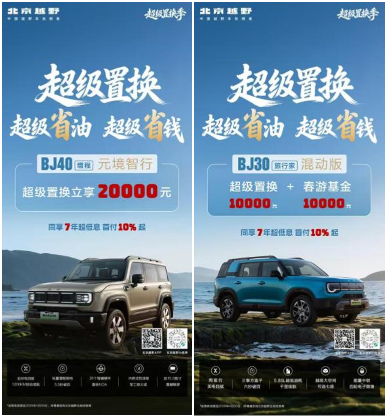 为了让消费者省下“真金白银”,北京越野用超级置换补贴和春游基金,进一步降低购车门槛。购买BJ30旅行家混动版的用户,可享超级置换补贴10000元,叠加春游基金10000元,共计20000元;购买BJ40增程元境智行的用户,可享超级置换20000元。同时,两款车型还均可享受7年超低息的金融政策,首付10%起,即可将爱车开回家。