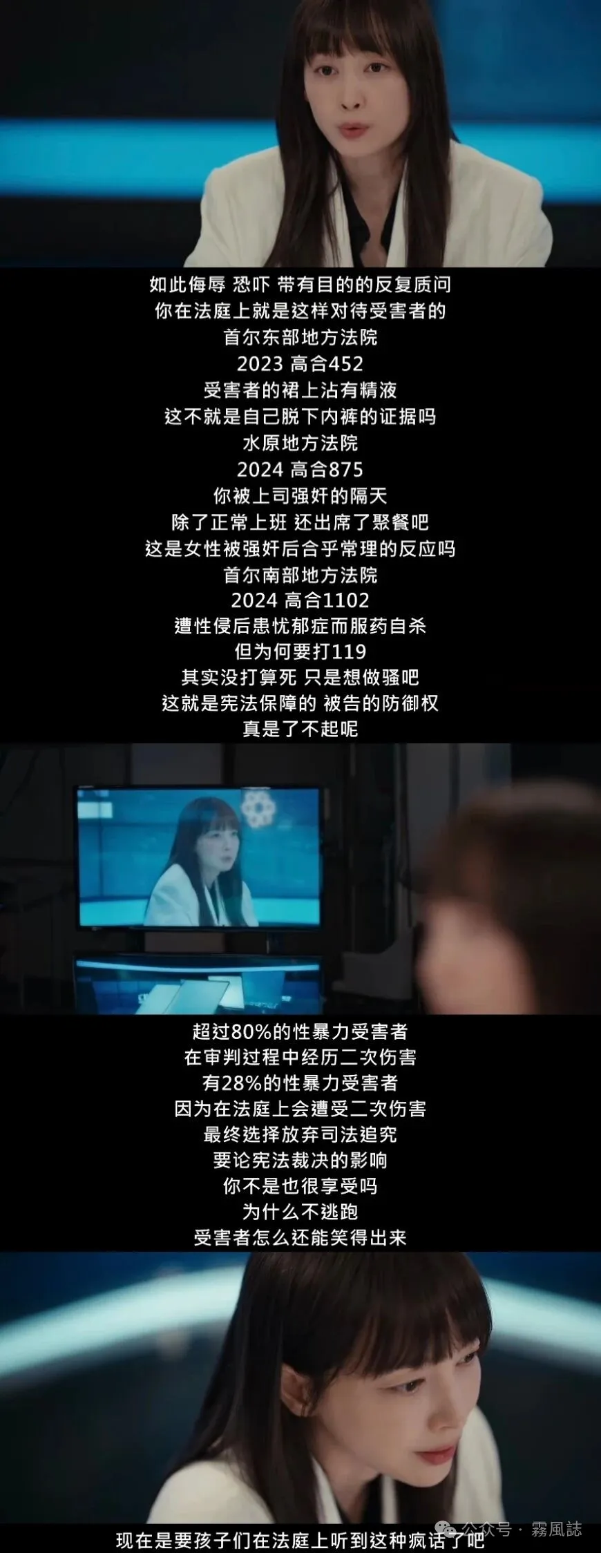 台词犀利批判性强,性犯罪主题明确。正如她所说,在另一边的法庭上,柔静正遭遇着律师的二次伤害——“你,不是第一次吧?”