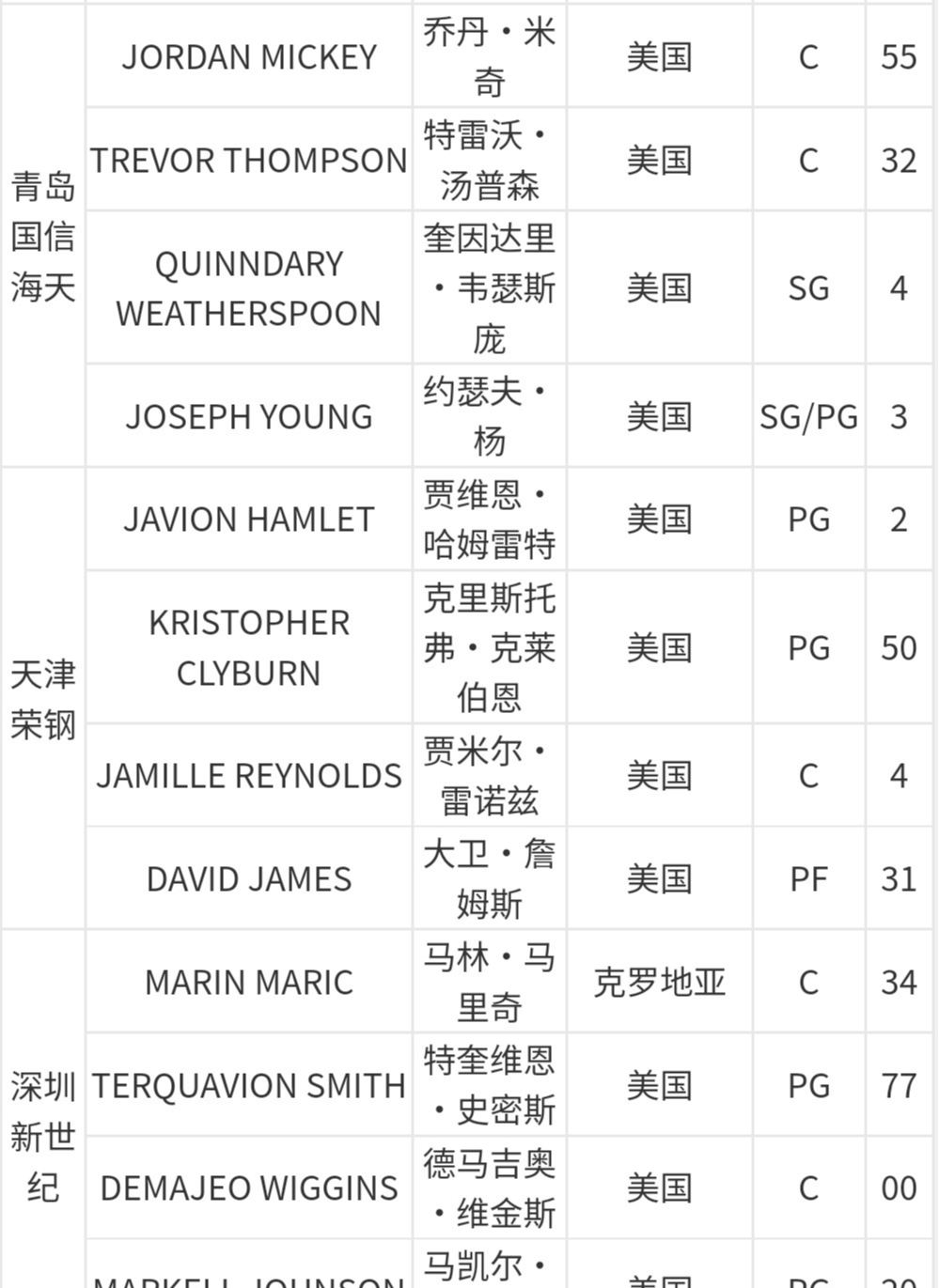 深圳男篮:马林·马里奇、特奎维恩·史密斯、德玛吉奥·维金斯、马凯尔·约翰逊。