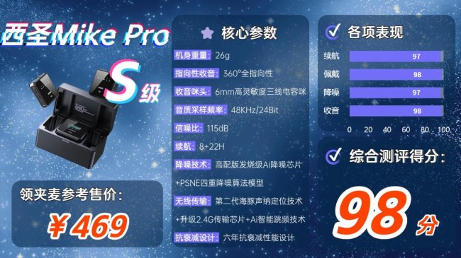 在专业级麦克风领域,西圣Mike Pro相较同价位竞品具备全方位优势,其信噪比处于行业顶尖水平,音质达到CD级效果。它的信噪比大于115dB,采样率为48kHz/24bit,频率响应为20-20kHz,失真率低于0.10%,延时低至20ms。还兼容各类相机、手机、平板和电脑。可以说配置体验彻底拉满,堪称目前百元级无线麦克风中的巅峰之作。
