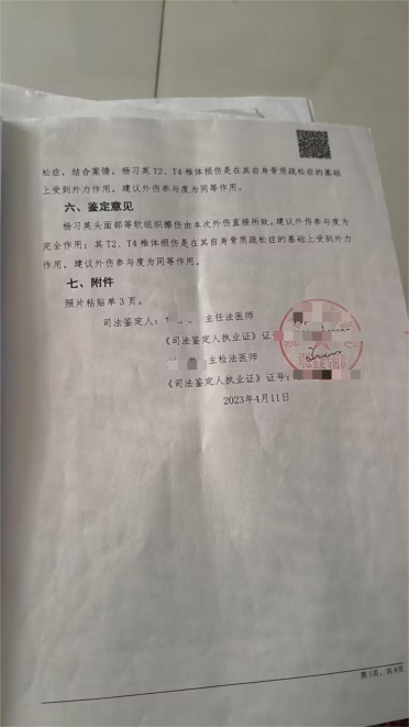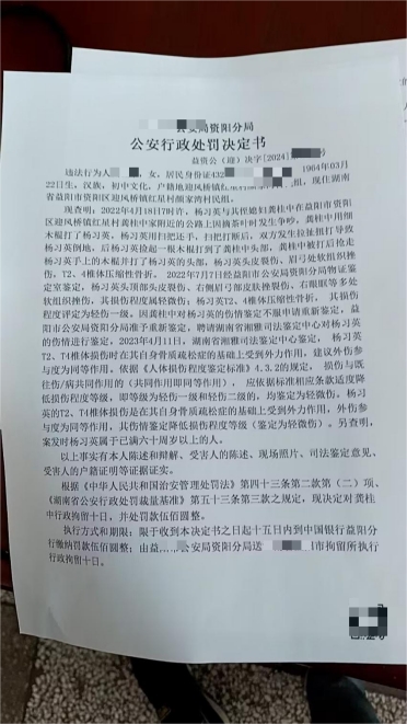 2022年7月7日,益阳市公安局资阳分局物证鉴定室出具第一份《鉴定文书》,明确指出:杨某英T2及T4椎体压缩性骨折,损伤程度评定为轻伤一级。这一结果原本意味着打人者将面临刑事责任。