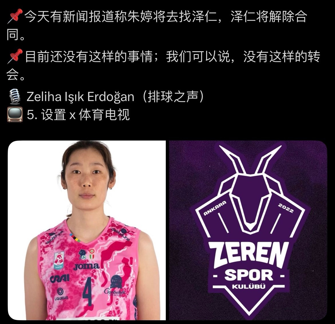 北京时间的2月17日,根据最新的报道,朱婷将会加盟土耳其的泽仁体育女排,而泽仁体育女排将会为朱婷支付违约金,本身朱婷的合同已经到期,这个转会消息还说为朱婷支付违约金,这就从侧面说明朱婷可能已经和科内利亚诺女排续约了。不过在2月18日的时候,这个转会消息已经被辟谣,也就是现在朱婷并没有加盟泽仁体育女排并且球队也没有为她支付违约金。泽仁体育女排本赛季在土耳其联赛表现非常强势,是排名前三的球队,但球队非常年轻。