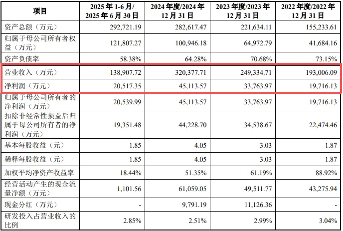 这份高增长曲线却在2025年上半年戛然而止,公司营收、净利同步大幅下滑,更严峻的是,全年业绩预测同样承压。招股书披露,公司预计2025年营业收入27.74亿元,较2024年下滑13.40%;归母净利润预计4.13亿元,同比下滑8.40%。IPO临门一脚之际,业绩增长按下“反向键”,为其上市之路蒙上阴影。