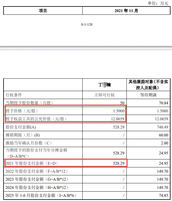 此外,2021年,惠康科技通过员工持股平台实施股权激励,实际控制人陈某鹏的外甥丁某楠以“公司顾问”身份参与,以每股1.5元的低价获取激励份额,较同期12.07元/股的公允价值大幅折让。更为反常的是,此安排未设服务期限,但导致公司确认了528.29万元的股份支付费用。