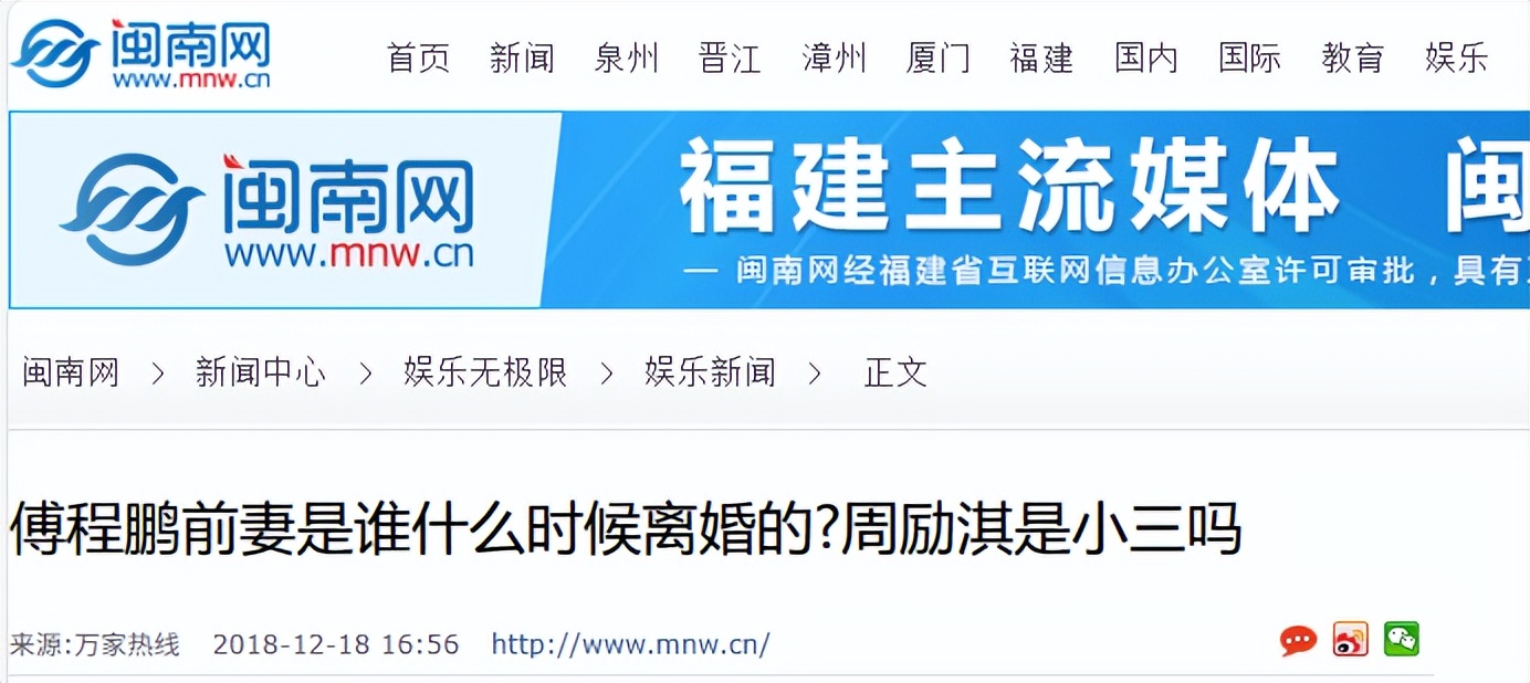 闽南网 2018-12-18——傅程鹏前妻是谁什么时候离婚的?周励淇是小三吗