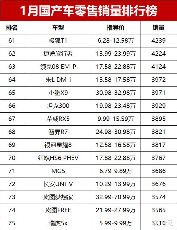 问界M7依旧是高端新能源SUV里的大热门,1月销量26454辆,位列第四。吉利星越L定位家用品质SUV,销量23815辆,排名第五。同品牌的星瑞以19027辆排在第六,是国产轿车里的主力担当。值得一提的是,1月份吉利汽车共有5款车型进入国产车销量榜的前十榜单,成为本月乘用车市场上的最大赢家。