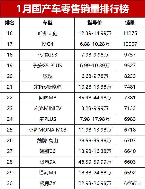 曾经的代步神车宏光MINIEV,1月只卖了7133辆,排在第二十三位,和巅峰时期相比差距明显。秦PLUS销量6983辆,第二十四位,比亚迪旗下多款车型销量相比之前都有所回落。问界M8销量7381辆,第二十二位,在高端MPV里表现还算稳定。