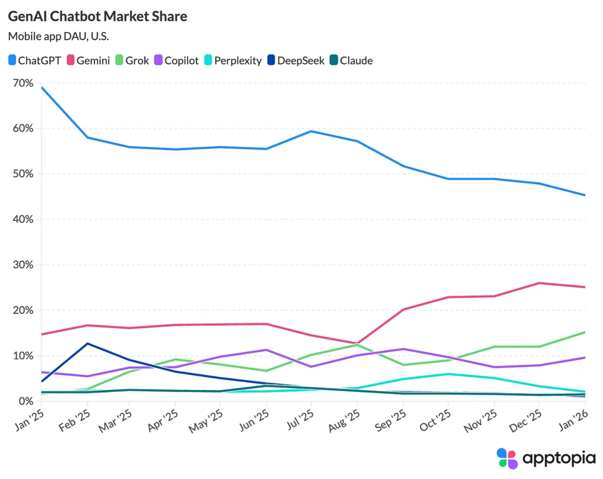 Apptopia数据显示,在2025年1月至2026年1月期间,ChatGPT在美国移动应用日活跃用户中的市场份额从69.1%下降至45.3%。同期,谷歌Gemini的市场份额从14.7%提升至25.1%,而埃隆·马斯克(Elon Musk)旗下的Grok增长更为迅速,市场份额从1.6%跃升至15.2%。
