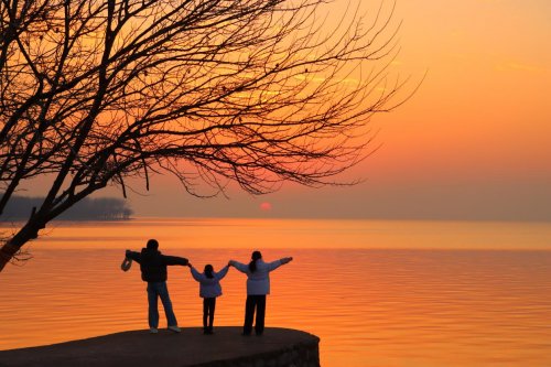 下午:水釜城+渔人湾——诗意与烟火的碰撞 从大堤步行至水釜城,仿宋园林的亭台楼阁映着小桥流水,仿佛闯入现代版“清明上河图”,穿汉服拍照秒出古风大片。傍晚前往渔人湾,沙滩上孩子们追着浪花挖沙捡石,网红咖啡摊飘来香气,找个角落坐下等待日落,水天相接的橘色晚霞美得让人沉醉。