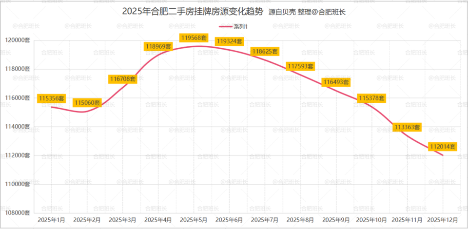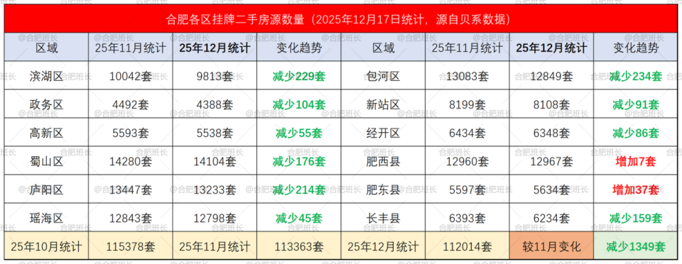 12月17日统计贝系前端挂牌二手房源112014套,较11月同期统计减少1349套,这也是合肥连续7个月挂牌量下降、连续5个月挂牌量下降千套以上,下降趋势明显。