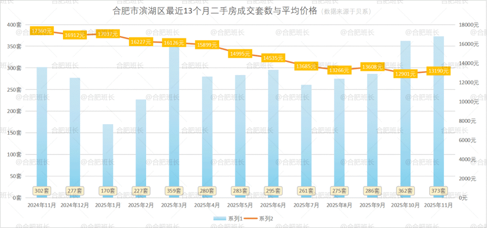从近13个月成交数据看,2025年滨湖区成交量比较稳定,一直在300套左右,11月份再创新高。价格在10月回落到1.3以下后,再度攀升至1.3万以上。