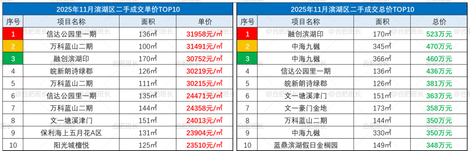 11月份3万以上5套房源分别来自信达公园里一期、万科蓝山二期、融创滨湖印和皖新朗诗绿郡,除皖新朗诗绿郡外,其他均为洋房。
