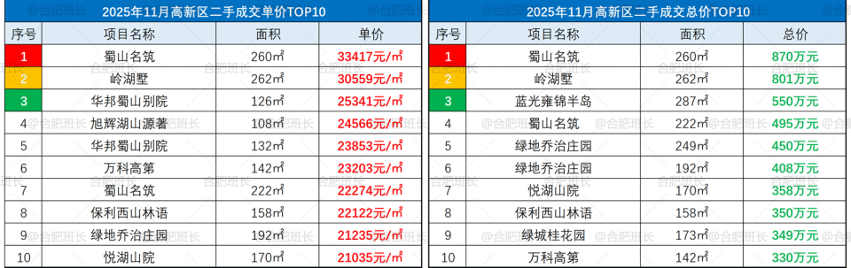蜀山名筑成交1套260平别墅,单价3.34万、总价879万,夺得单价、总价双料冠军。另一套3万成交来自中海岭湖墅262平别墅,单价3.06万、总价801万。