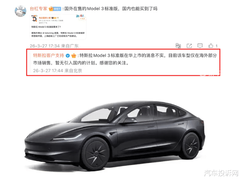 3月27日,特斯拉客户支持官方账号在社交媒体辟谣,针对网传Model 3标准版即将在华上市的传闻,明确表示该消息不实。目前该车型仅在海外部分市场销售,暂无引入国内的计划。