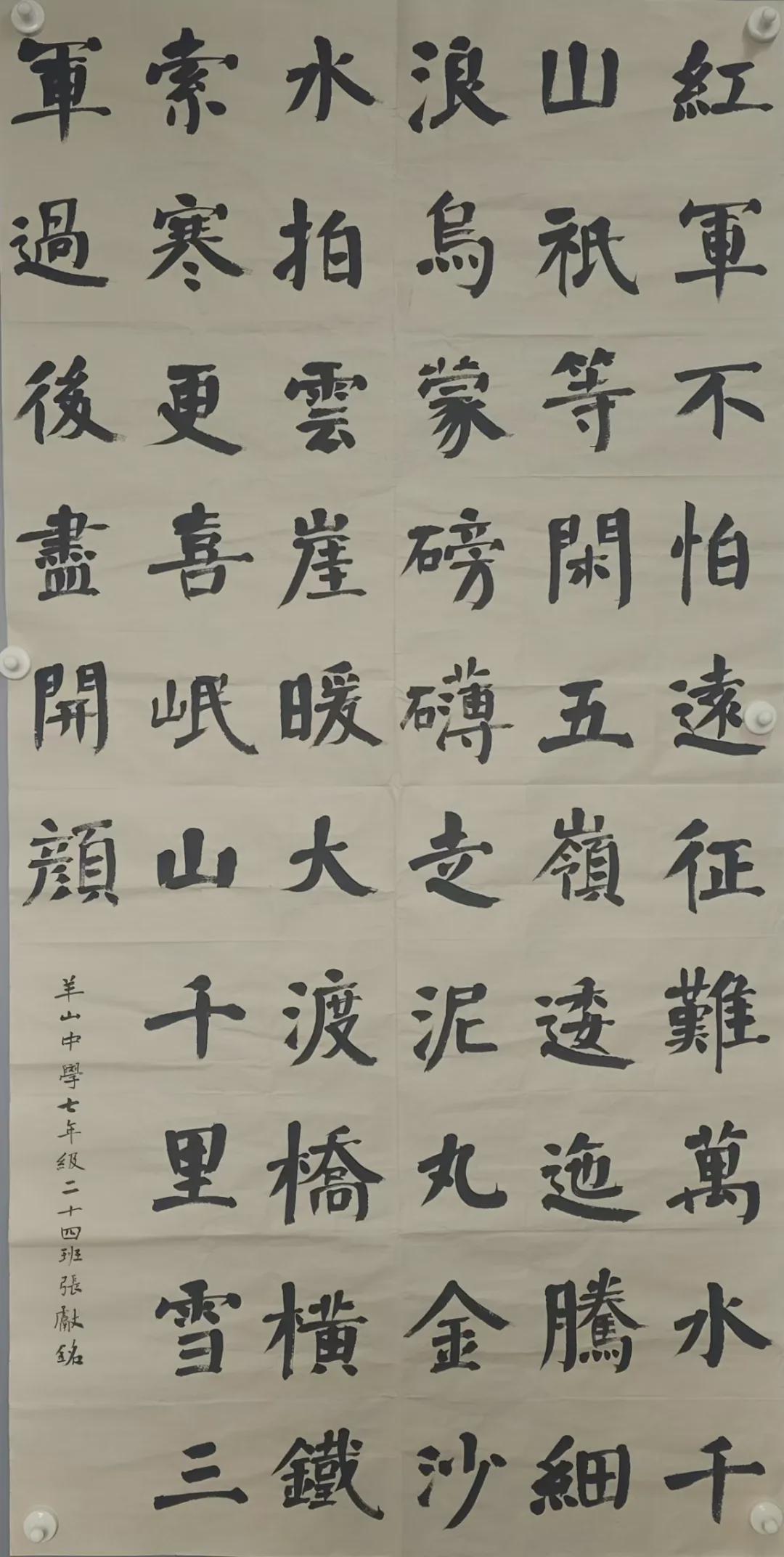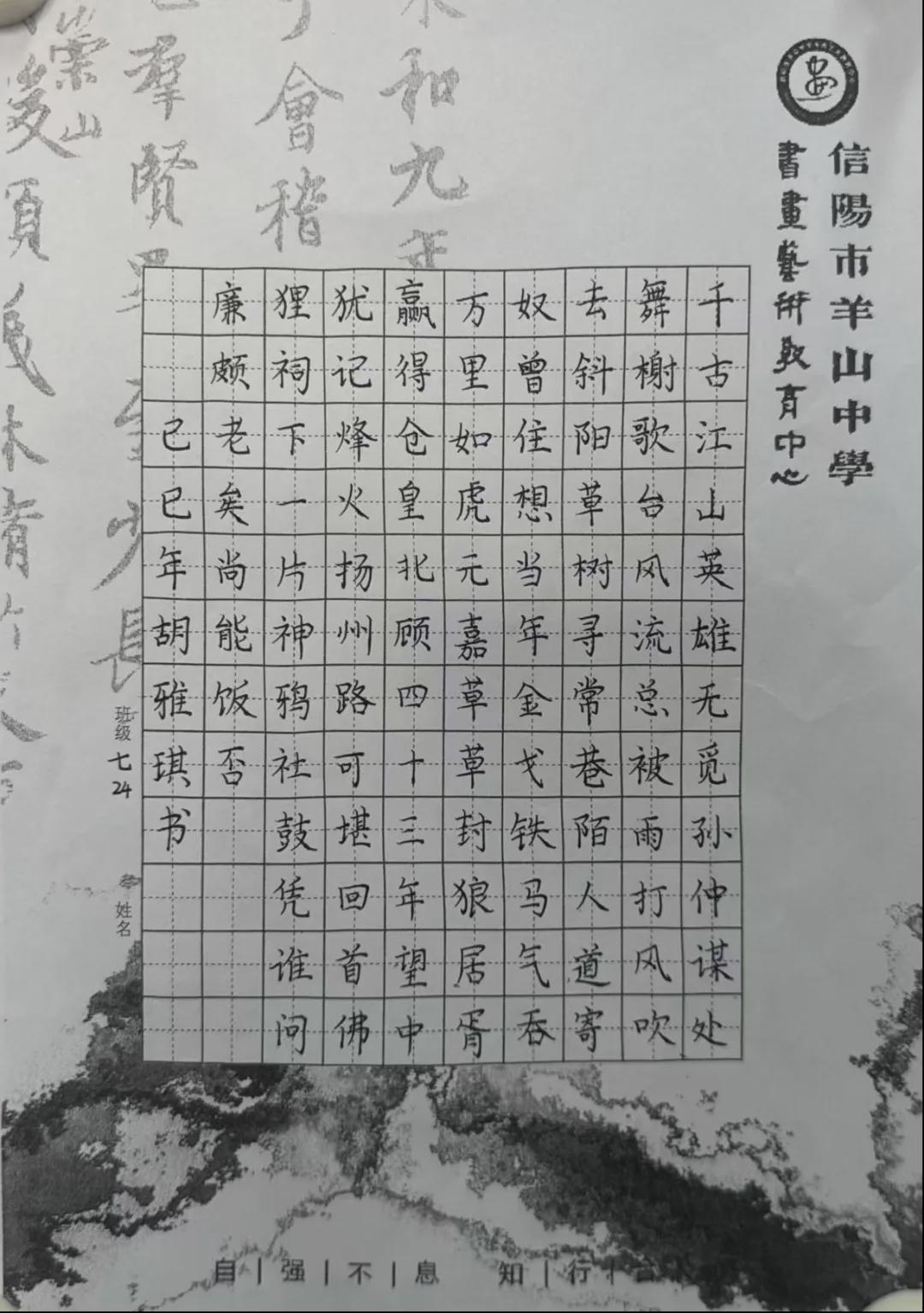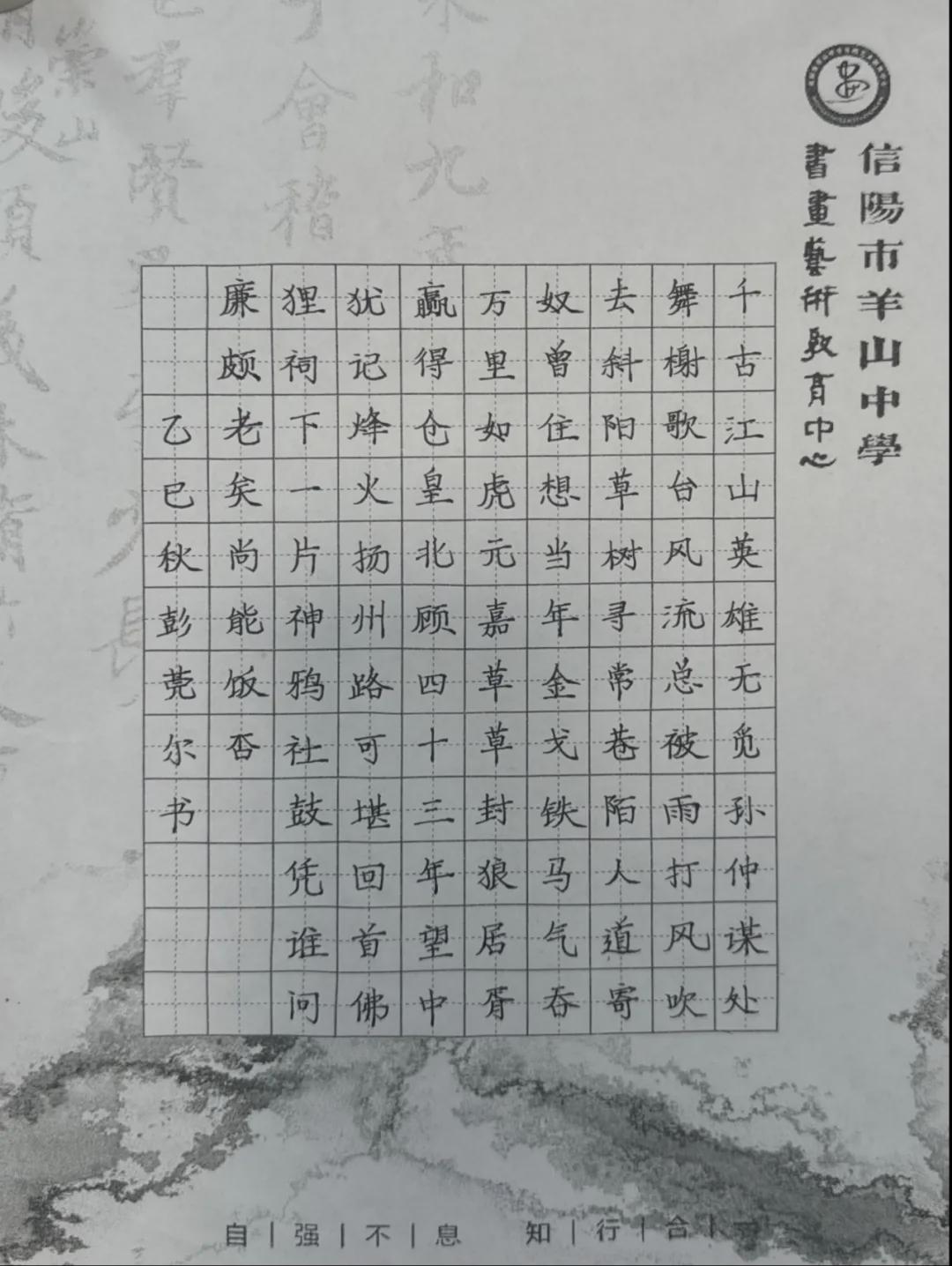 以墨养心,在横竖撇捺间感悟汉字智慧,滋养文化自信;以字正身,培养端正、整洁、美观的书写习惯,落笔见品格;以艺育人,提升审美素养,让书写成为心灵的修行。为贯彻落实教育部印发的《关于进一步加强中小学规范汉字书写教育的通知》精神,提升信阳市羊山中学学生规范书写意识和书写水平,培养爱国情怀与民族精神,坚定文化自信,营造浓厚的书香校园文化氛围,信阳市羊山中学于近期举办了以“翰墨飘香,文韵悠扬”为主题的第二届汉字书写大赛。