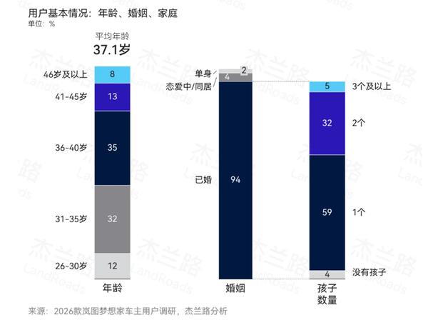 调研显示,2026款岚图梦想家车主以高职位、高收入的高净值人群为主,家庭平均年收入达50.7万元,超六成车主处于企业或组织的决策层与管理层。车主群体以成熟家庭为主,平均年龄37.1岁,已婚比例高达94%,二孩及以上家庭占比达37%,家庭出行需求成为购车核心动机。