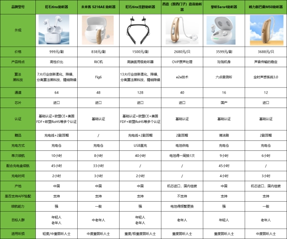 选之前先把表格过一遍,像考前看提纲一样省心,我觉得少走很多弯路;关键参数摆在一张表里,优缺点一下就亮出来,纠结值瞬间下降。下面就是本次测评参与的几款助听器的详细数据,翻一眼,心里更有谱。
