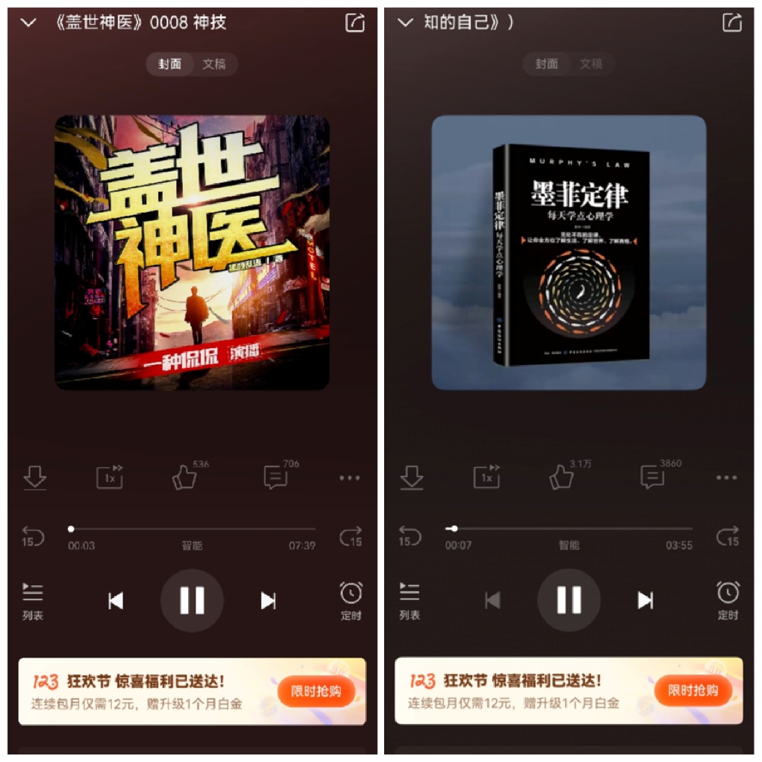 我们听书党真的狂喜,领到月卡免单券后我第一时间就兑换喜马拉雅会员,轻松解锁全站VIP专属的有声内容,以后上下班、睡前都可以畅听最近超火的《盖世神医》,男主虽身处乱世,但潜心修行自己的医术并实现人生逆袭,这故事情节越听越过瘾。如果想在路上给自己充充电,也可以听听《墨菲定律》这种自我成长类的书,充分利用碎片时间提升认知。