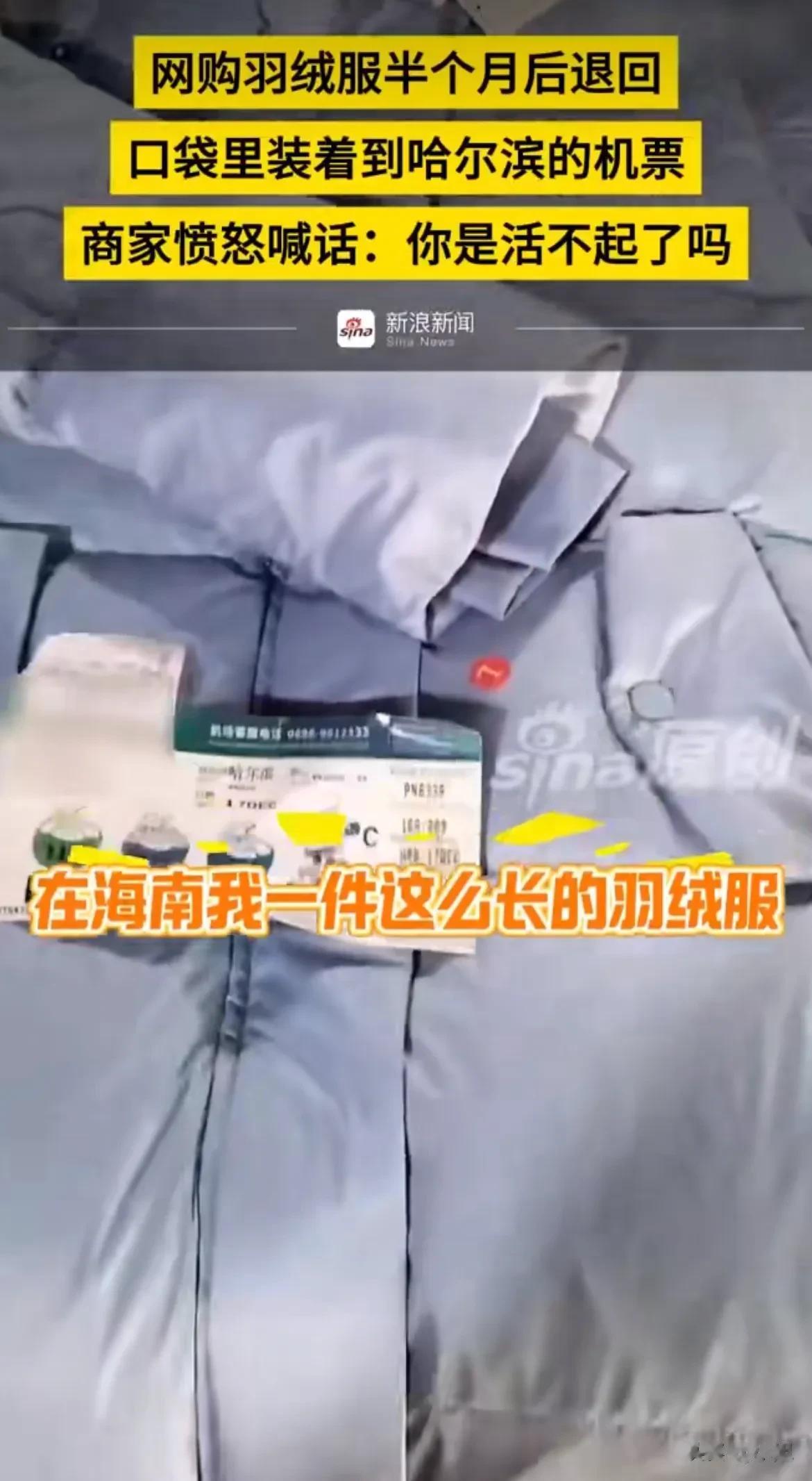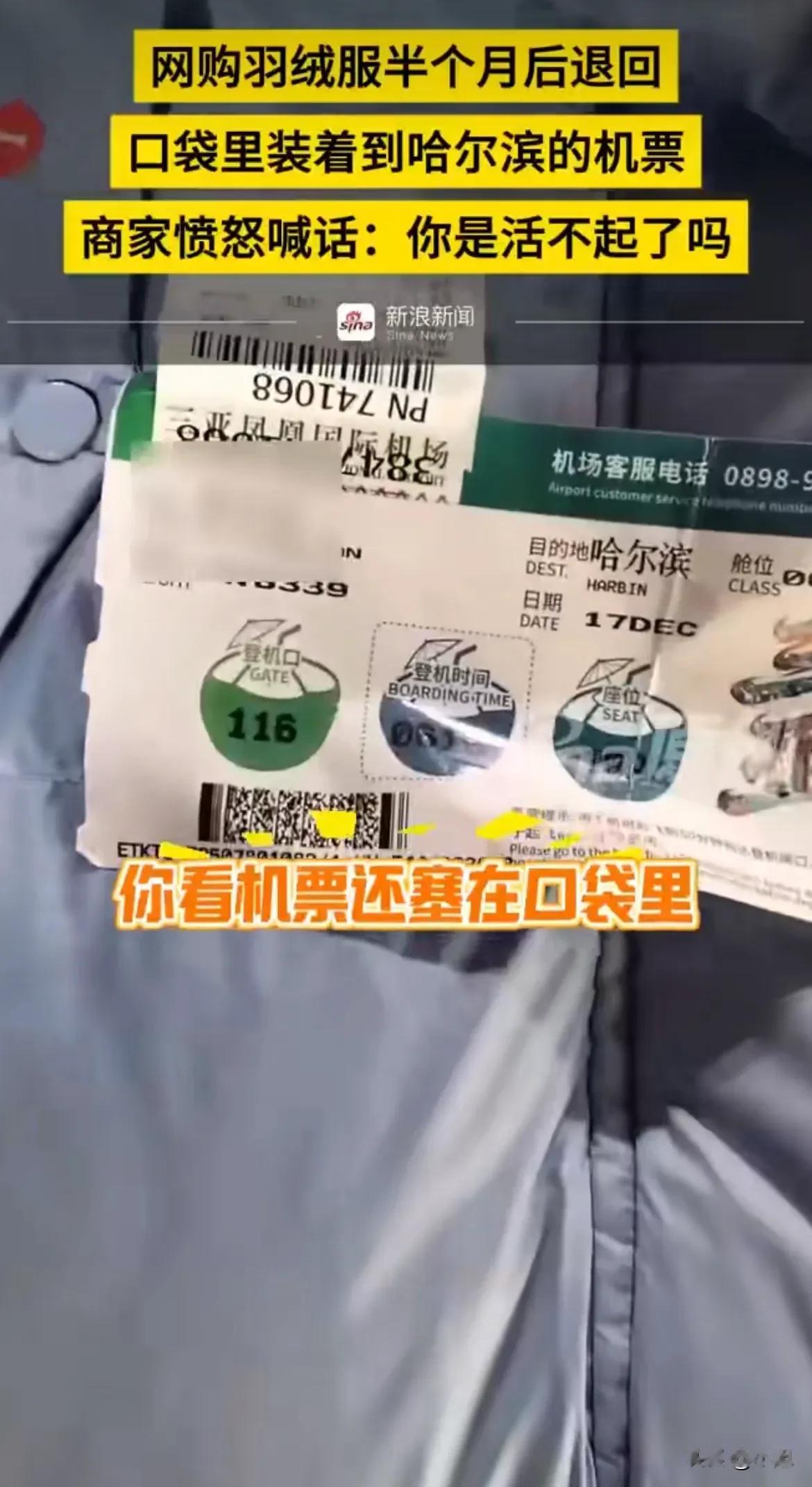羽绒服口袋里,藏着一张从海南到哈尔滨的机票。这是浙江一位商家在收到退货时发现的“铁证”。衣服被穿得满是油污,顾客却想全身而退。商家气得发抖,直接喊话:“你是活不起了吗?”