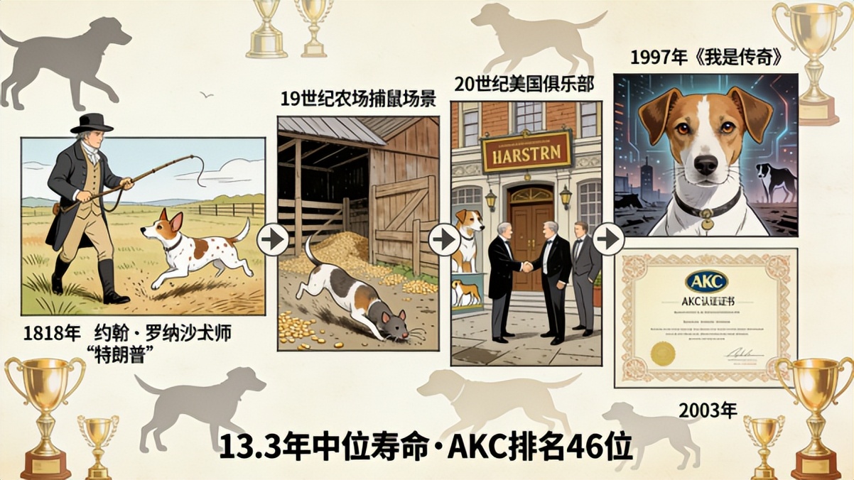 19 世纪末,该犬种因出色的捕鼠能力成为英国农场与贵族庄园的必备助手,20 世纪初随移民浪潮传入美国,1976 年美国杰克罗素梗俱乐部(JRTCA)成立,确立了原始工作型犬种标准。1997 年,因电影《我是传奇》中 “萨姆” 的角色,杰克罗素梗全球知名度飙升;2003 年美国养犬俱乐部(AKC)正式认证该品种,2024 年在 AKC200个认证品种中排名第 46 位,同时在英国 58 万条犬的寿命研究中,以 13.3 年的中位预期寿命跻身长寿小型犬行列。