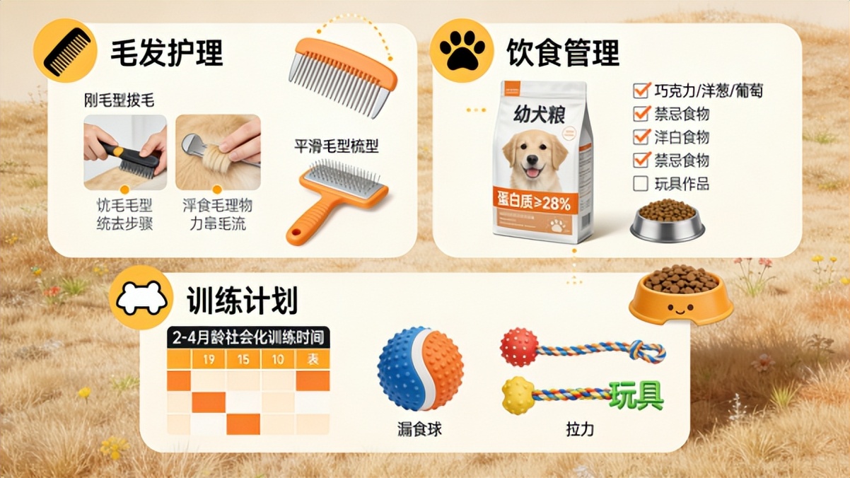 ◦ 幼犬(0~1 岁)每日喂食 3~4 次,选择中大型犬幼犬粮(蛋白质含量不低于 28%),可添加蛋黄补充卵磷脂;成犬每日 2 次,控制食量避免肥胖(理想体重不超过 7 公斤);