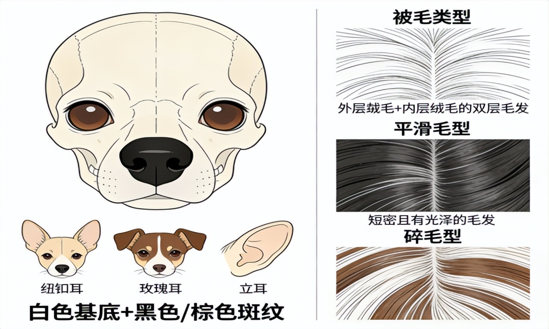 ◦ 毛发类型:分三类 —— 粗硬刚毛型(外层刚毛粗硬,内层有短绒毛)、平滑毛型(被毛短而紧密,富有光泽)、碎毛型(介于两者之间,毛发长短不均),其中刚毛型需定期拔毛维持质感;