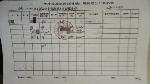 (相关退耕还林补助发放花名册、村级财务收支材料,由当事人提供)