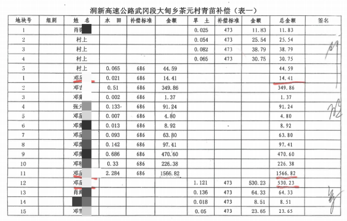 征地补偿发放相关事项 村民提出多项异议2011 年上半年,洞新高速公路在武冈市大甸镇原茶元村开展征地工作,征地范围涉及水田、旱土、成片林等多种地类。根据留存的补偿款发放明细显示,补偿标准根据地类不同分为多个档次,涉及数十名村民及村组集体,针对部分款项的发放情况,有村民提出了异议。