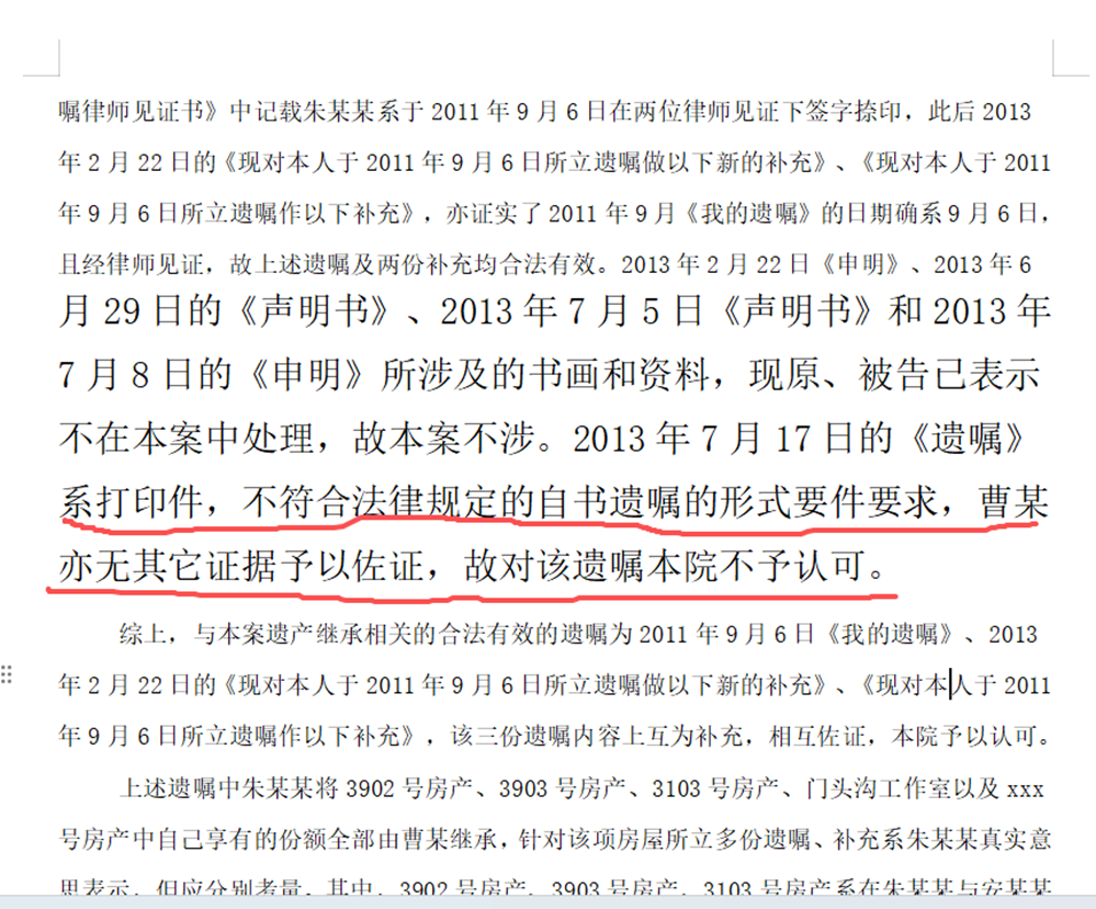 判决书中的细节,字字戳中痛点。法院认定,2013年的打印遗嘱因不符合自书遗嘱形式要件,直接无效;2009年的草稿未明确“赠予”归属,效力存疑;唯有2011年那份经律师见证的遗嘱,虽落款未写具体日期,但结合后续补充遗嘱及见证记录,最终被认定合法有效。