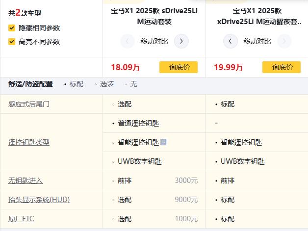 咱车友选车,性能、配置、实用性总得占一样吧?先看核心差异!sDrive25Li是前置前驱,日常通勤够使,但想跑个山路、遇个雨雪天,底气就弱了一点。xDrive25Li曜夜多了适时四驱,抓地力直接升级,还标配感应尾门、UWB数字钥匙,质感拉满。