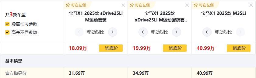 从官方指导价上,sDrive25Li版31.69万,xDrive25Li曜夜版34.99万(贵3.3万),M35Li版40.99万(比曜夜贵6万,比sDrive25Li版贵9.3万)。