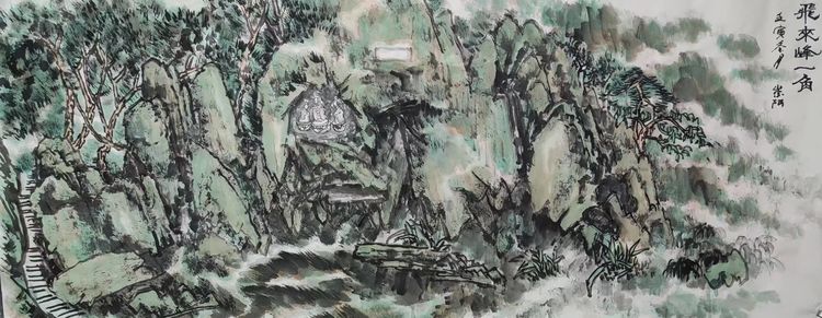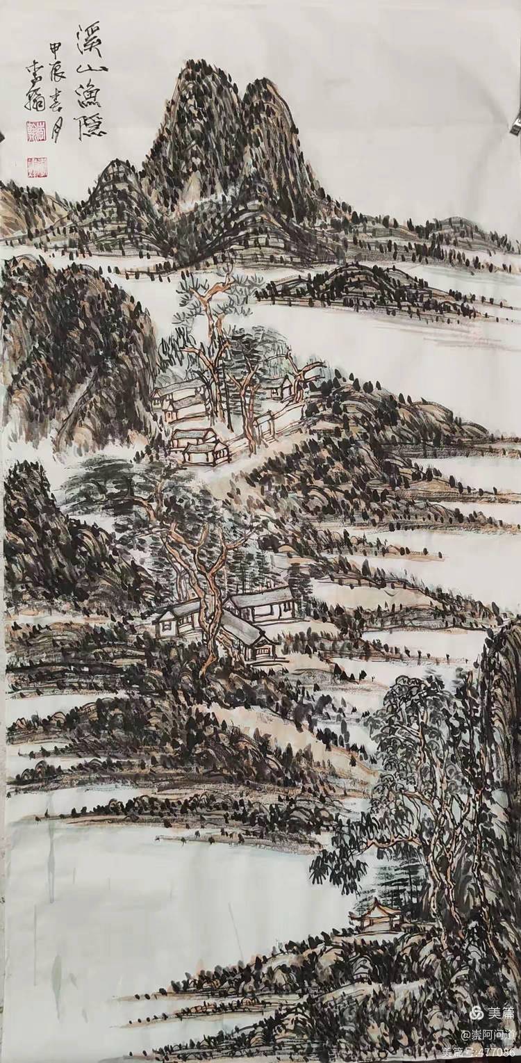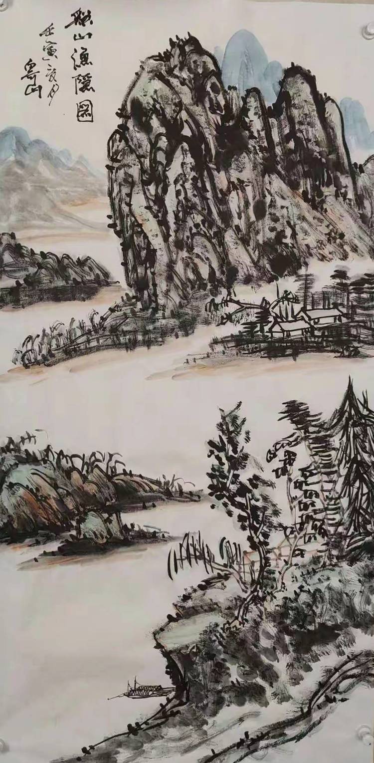 在一些地域风貌相近的画作中,李翰先生也是善以不同的视觉角度来进行构图造境。其中最以奇雄博大,险峻高迈之景著称画坛!一幅幅纵向构图山高水远,看似取景容易,实则却是很少有人能在领略山水真迹的基础上,再于画端复现万般景象。但在李翰先生画中,诸如奇峰绝壁,大水悬流,怪石苍松,幽人羽客,皆是能尽显无遗,此真如古诗论画云:"画笔善状物,长于运丹青;丹青入巧思,万物无循形!"就比如看他的《飞来峰一角》,《溪山渔隐》等作。画中笔墨皆以皴擦之法见张,同时又不失水墨渗化的淋漓韵味,前者是以粗笔勾斫山石肌理,后者则在浓淡相宜间渲染天地元气。因此无论是绘作丘壑渔居之旷逸,还是奇峰绝壁之险绝,亦或是曲径通幽的林木层叠,在李翰先生的笔下,都是极具深邃的画境空间,而非是单纯的平面结构堆砌。清溪倒峡掩映以通泉脉,飞磴盘空曲折以达幽邃,远视苍苍,近视茫茫,观之着实令人瞻恋不已!笔墨间独领林泉高致,方寸中尽显造化神工,操笔如在深山,居处如同野壑,修为如此,堪称非凡!