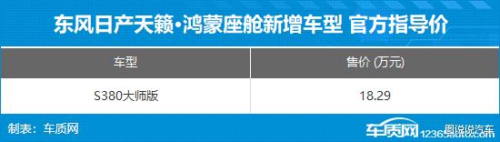 2026年2月24日,东风日产官方宣布,旗下天籁·鸿蒙座舱S380大师版正式上市,官方指导价18.29万元,上市限时价16.19万元。官方表示,购车可享0首付+8年低息日供金融方案,至高1.9万元装备礼。新车采用曜岩黑金双色车身以及曜夜黑红内饰配色,配备华为鸿蒙座舱5.0,并搭载2.0T VC-Turbo可变压缩比发动机。