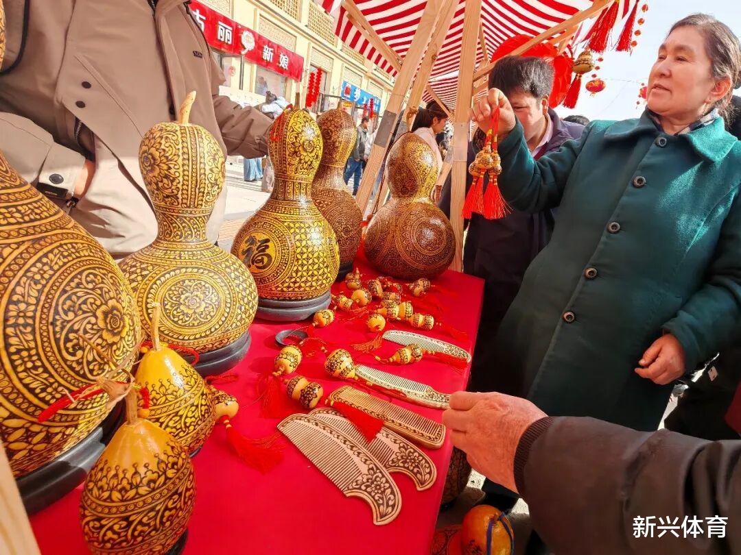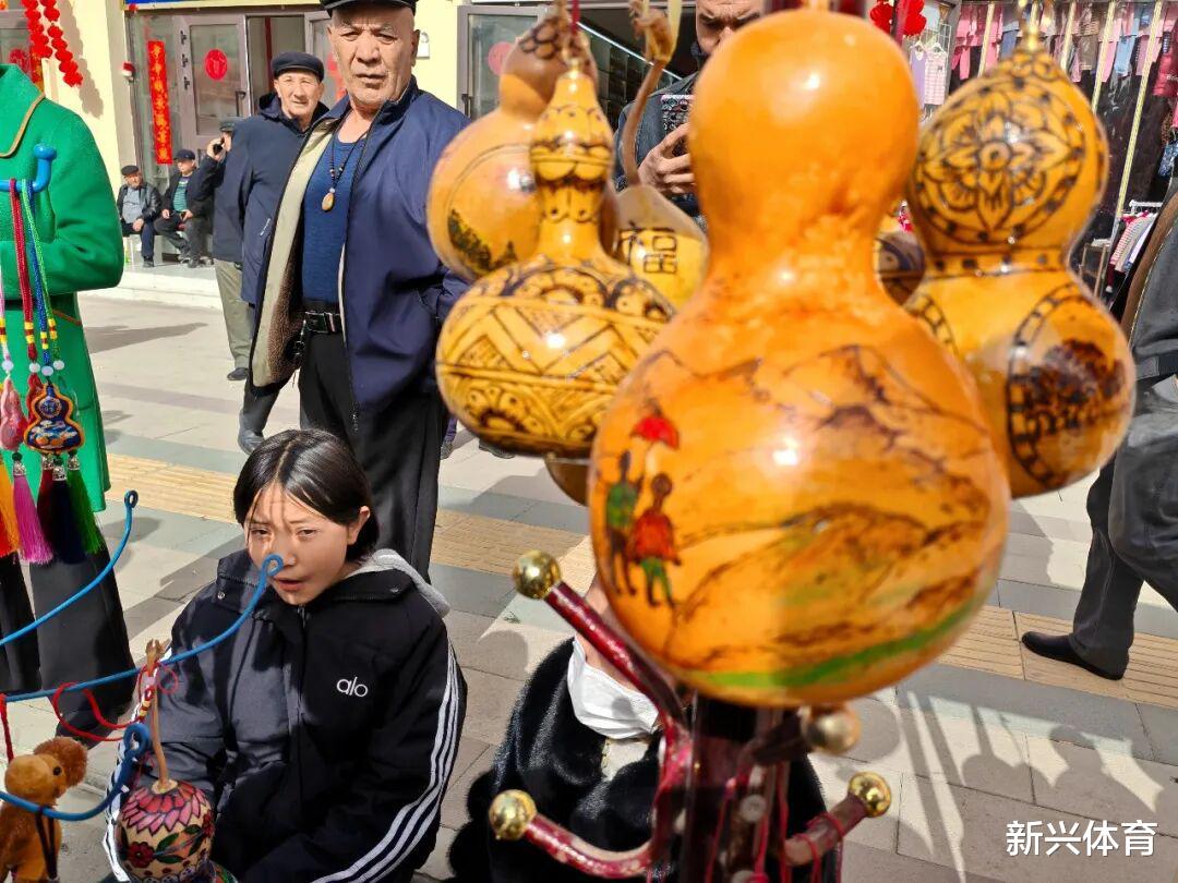 年货大集上买葫芦的不止图尼亚孜一家,身旁就有他们的同行,32岁的非物质文化遗产传承人、葫芦烙画艺人希尔艾力·艾比布拉的摊位。