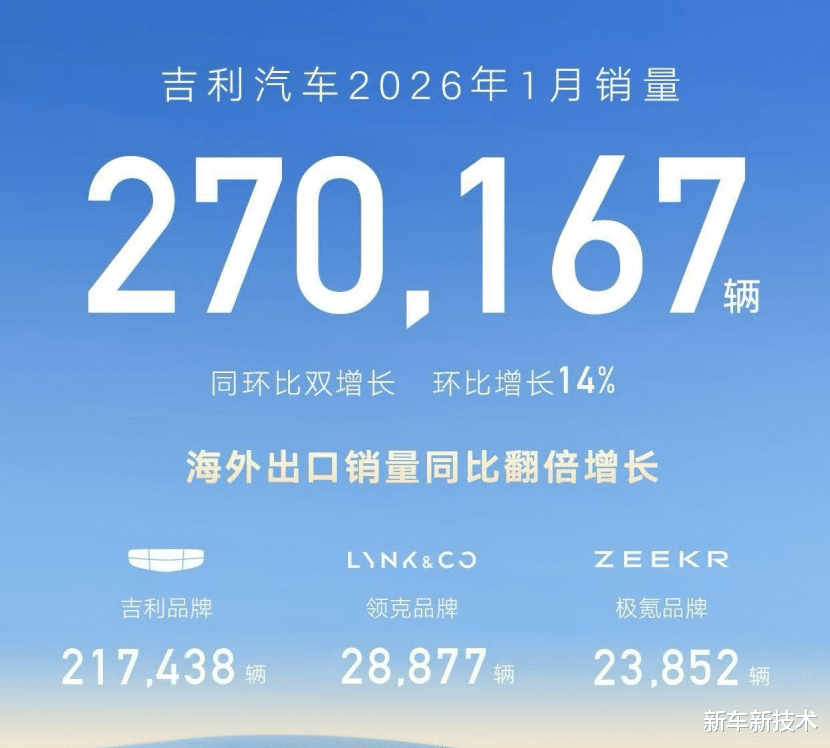 2月1日,吉利汽车发布1月销量数据。数据显示,吉利汽车销量达27万辆,实现同环比双增长,登顶中国自主品牌月度销量冠军。