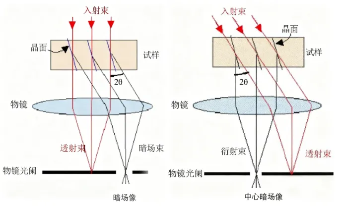 物镜光阑未发生偏转的透射束暗色亮色明场像与暗场像成像原理对比示意图。