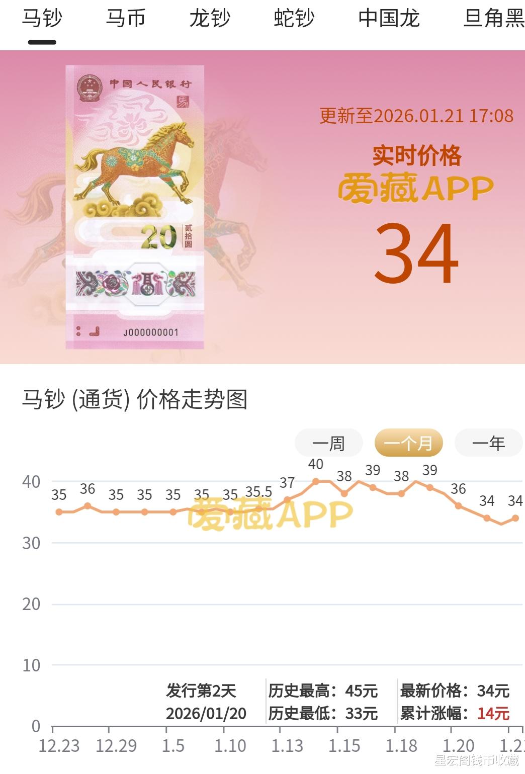 2026年马年纪念钞昨天开盘价格在40元左右,但是这个价格其实维持的时间并不是太长,很快价格就下跌到了38元左右。但是38元这样价格也维持不了多久,到了晚上2026年马年纪念钞一路下跌到35~36元左右,到今天晚上最新的市场行情也已经下跌到了34~35元左右。