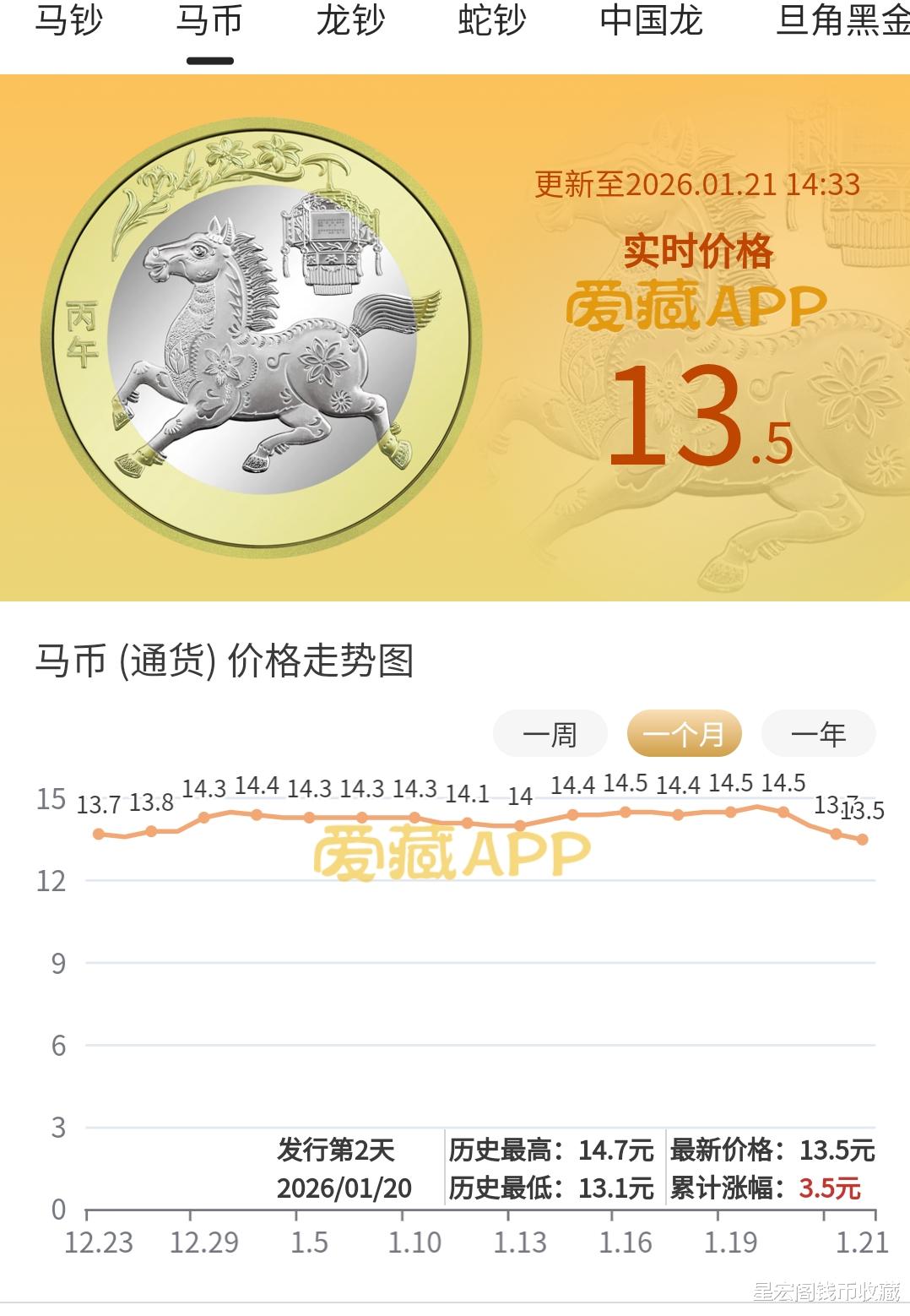 2026年马年普通纪念币昨天最高的时候到过15.5元左右。但是到了晚上,整个市场行情就出现下跌,从15.5元的市场行情一路下跌到14元左右,好在现在市场行情也有一些回暖,目前市场上收购报价在13.8~14.4元左右。