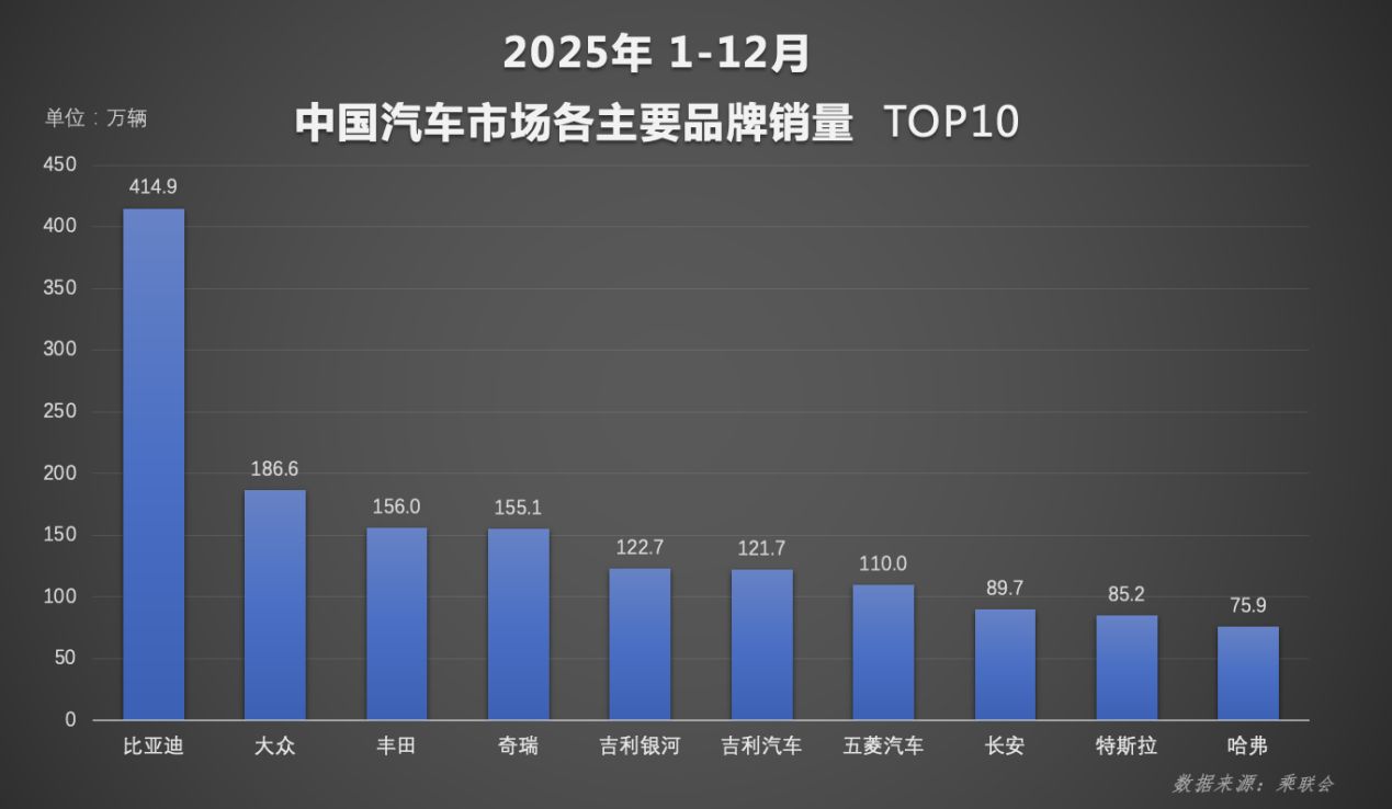 随着 2025 年圆满收官,中国汽车市场交出年度成绩单。行业数据显示,比亚迪在 12 月及 2025 年全年中国汽车市场品牌销量、新能源销量、集团销量等多个核心维度均位列第一,并连续四年蝉联全球新能源车市场销量冠军、中国汽车市场品牌四连冠,以冠军之姿持续领跑新能源汽车市场。比亚迪全球四连冠的硬核实绩,更是中国汽车品牌向上突破的最佳印证。