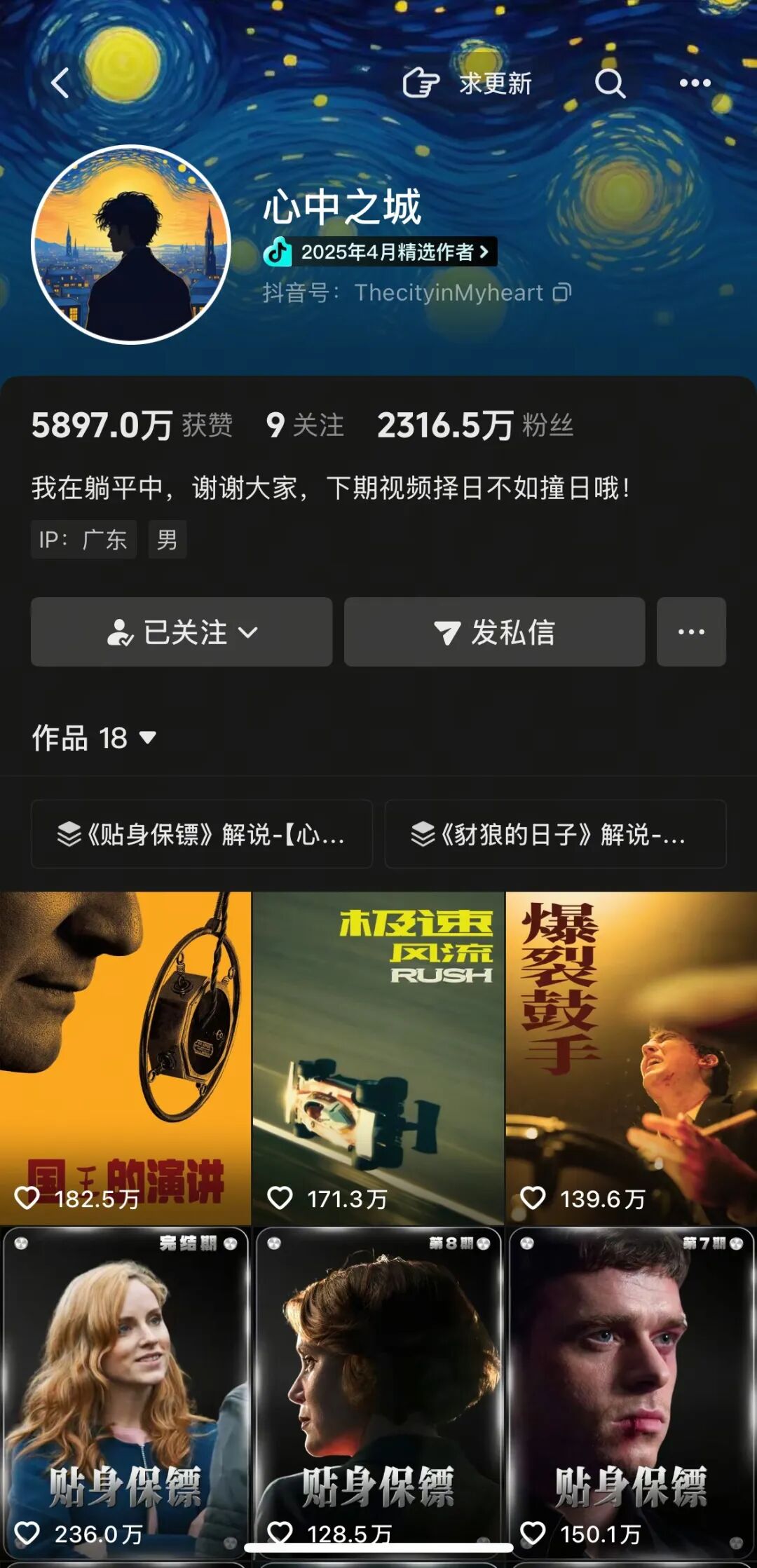 4月9日,“心中之城”在抖音发布了第一条视频,内容是深度解说英剧《豺狼的日子》。首个视频以“顶级杀手也不想上班了”为标题,剖析主角因“甲方赖账”展开复仇的故事,被提炼为“被践踏者的尊严反抗”。