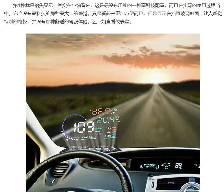 抬头显示没用?在高速上面还是有用的好吧,有时候就是你一分神看仪表盘可能就出事故了,而且抬头显示亮度角度高度都可以调,大不了调低一点点就好了