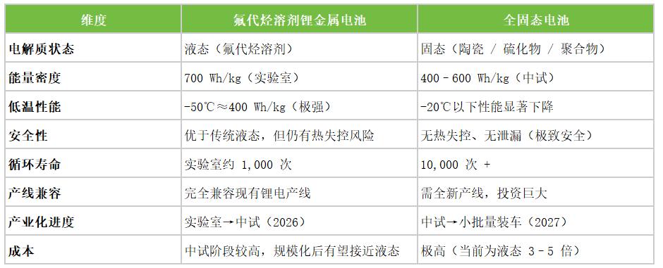 二者是分场景互补、长期共存而非替代的关系。例如在乘用车、商用车大规模量产、储能电站、轨道交通等领域,安全优先级最高,固态电池不可替代;但是在极低温场景下,如-40℃至-50℃的极地、高空、寒区装备,氟代烃体系仍高效放电,固态电池难以企及。